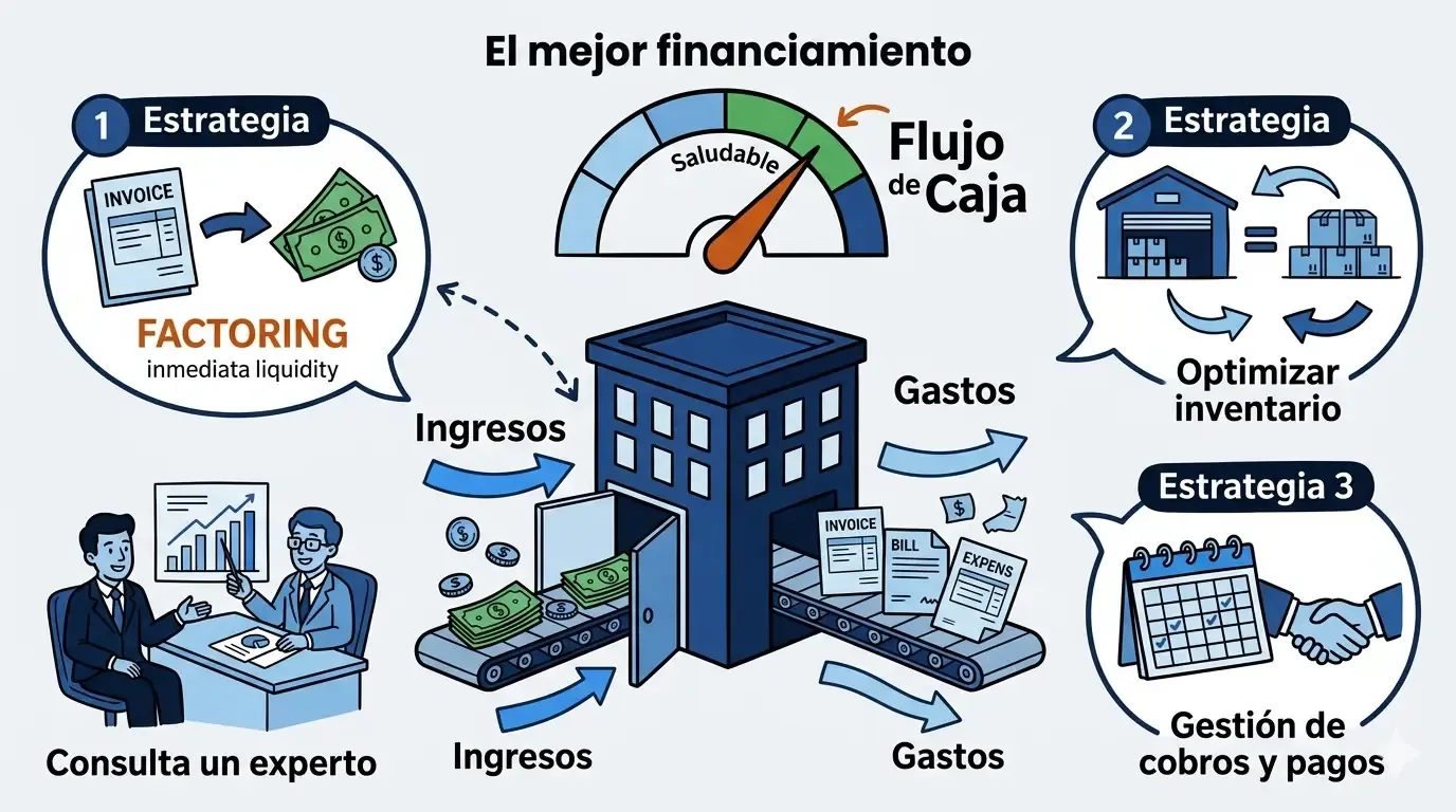 - Factoring: Vender cuentas por cobrar a una entidad financiera para obtener liquidez inmediata, mejorando el flujo de caja sin incrementar la deuda.
