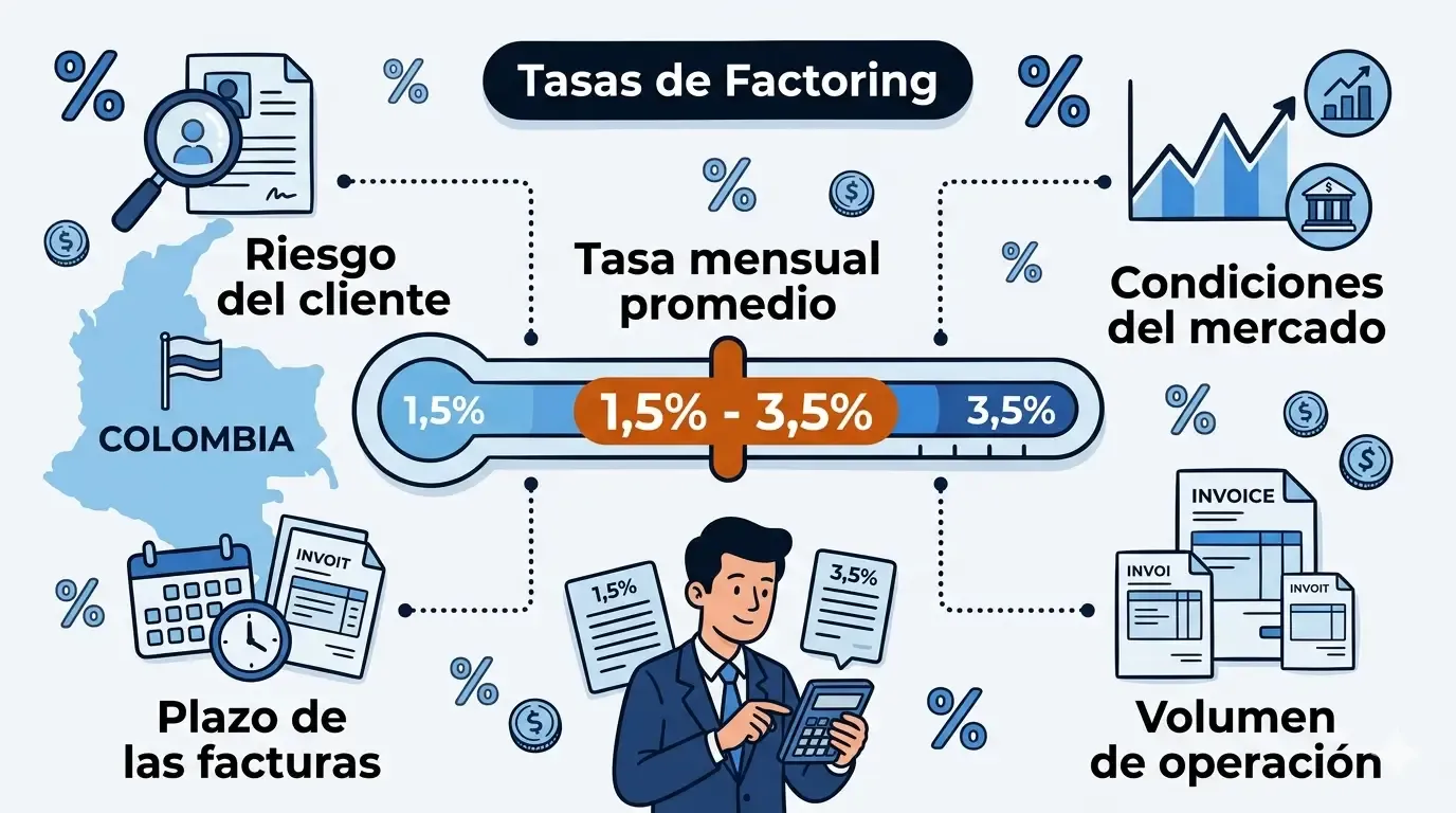 Según datos proporcionados por diferentes actores del mercado, las tasas de factoring en el país suelen oscilar entre el 1.5% y el 3.5% mensual (Exponencial Confirming) (Economista Colombia) . Estas tasas pueden variar según varios factores, como el riesgo del cliente y las condiciones del mercado (Exponencial Confirming).